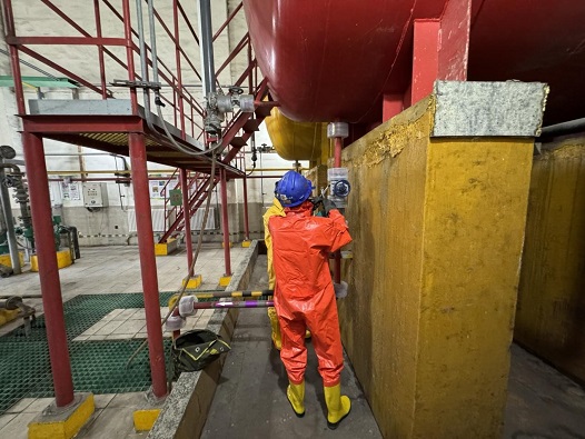 演练开始,随着运行人员第一时间发现泄漏并启动警报系统后,指挥组3分钟内完成集结,启动二级应急响应。接着抢险人员规范穿戴防护装备(防酸服、面罩等),采用专业堵漏工具实施处置,在15分钟内成功控制了泄漏源。