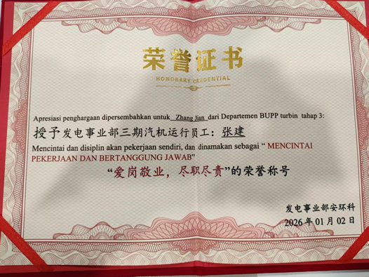 近日,印尼火电运维项目部张建、朱荣荣及时发现#9机组漏氢重大缺陷,迅速汇报并妥善处理,成功阻止了事故的进一步恶化,获得业主的表扬及现金奖励。