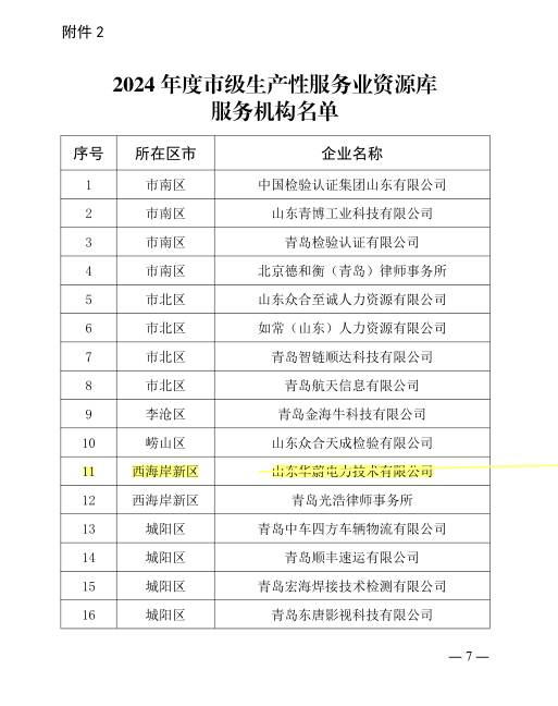 经过前期一系列严格的审核程序,华蔚电力成功纳入青岛市级生产性服务业资源库,证明了政府对公司为各产业提供高质量生产性服务资源能力的认可。